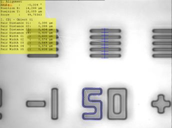 The programmed measurement structures were positioned exactly through image alignment. A high-resolution CCD camera records images whose gray value intensity profiles are used for the subpixel algorithms.