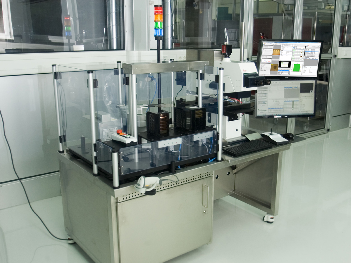 Unsere Mikroskopstation Promis-A mit Dual-Arm Roboter und Hochleistungsmikroskop kann für vielfältigste Untersuchungen genutzt werden. Auch transparente Materialien können von Handling und Aligner bearbeitet werden.